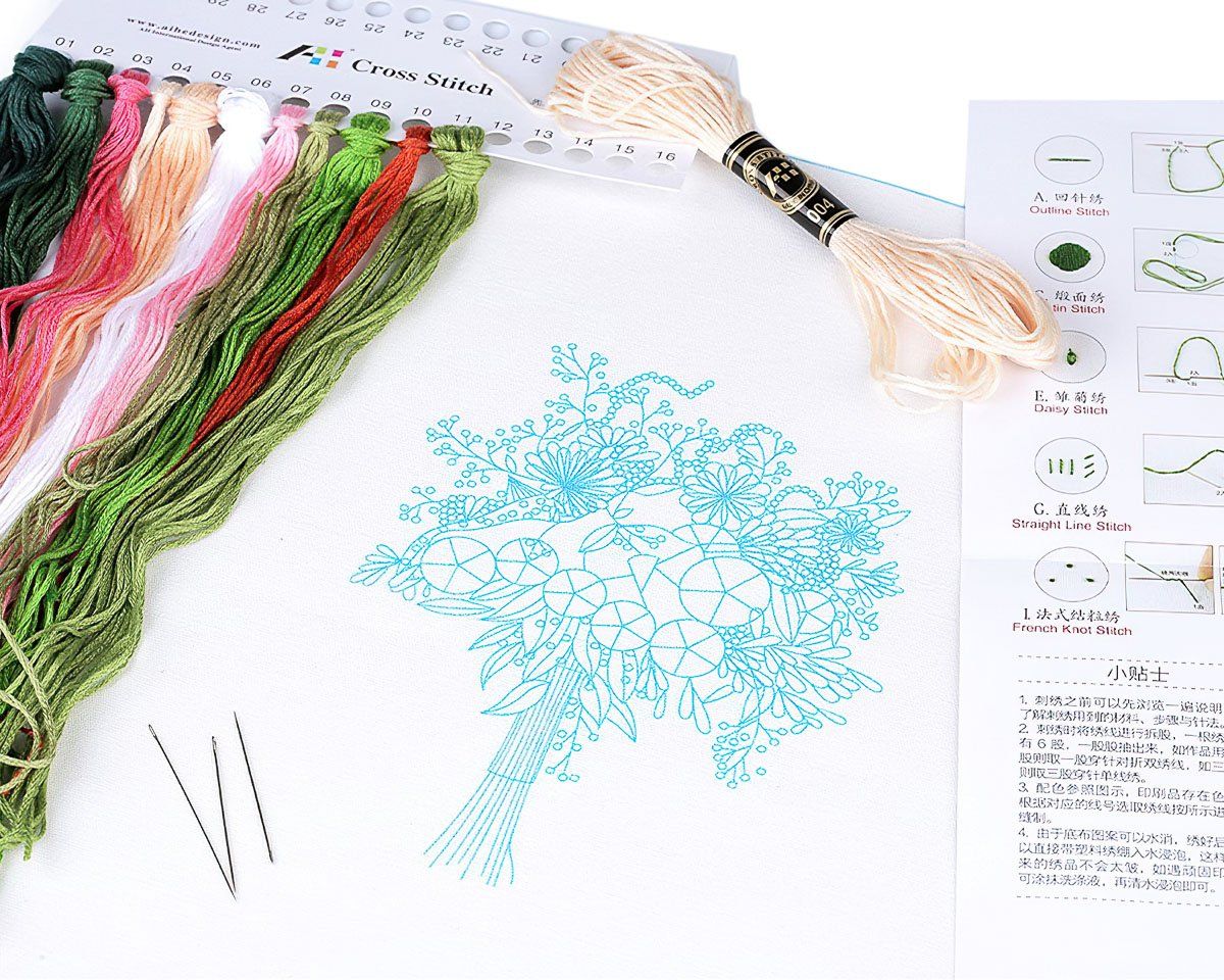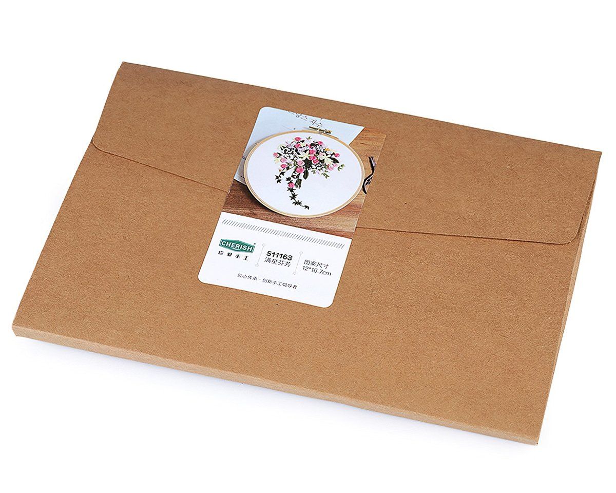 Sada na vyšívání s motivem růžovo-žluté kytice. Vyšívá se na předtištěnou tkaninu pomocí příze mouline (mulinka). Vyšívací sada obsahuje vyšívací tkaninu s předlohou, sadu barevných přízí, obrázkový návod a vyšívací jehly. Rozměr samotného obrázku je 12 x 15,2 cm. Dodáváno v dárkovém balení v podobě tvrdé, papírové obálky o rozměru 15 x 22 cm. Vyšívací kruh není součástí balení. Lze použít kruhy o průměru max. cca 21 cm.