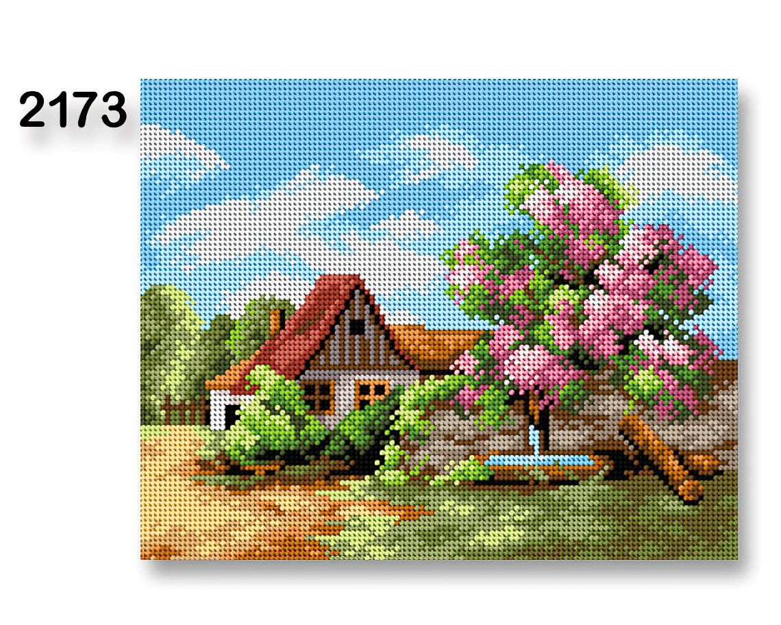 Vyšívací předloha s motivem domu s rozkvetlým stromem Předloha na vyšívání ze 100% bavlny je vhodná zejména na křížkový steh, nejlépe při použití přízí mouline (mulinka), které na výšivce nejlépe vyniknou. Obrázek na vyšívání má rozměr 24 x 30 cm.