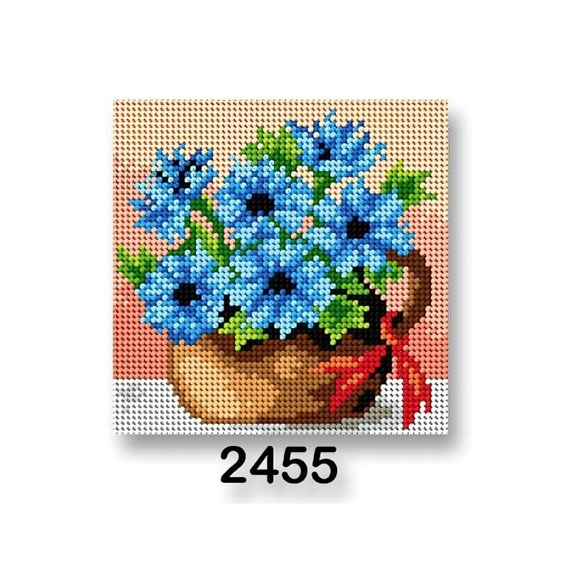 Vyšívací předloha s motivem modrých květin ve vázy. Předloha na vyšívání ze 100% bavlny je vhodná zejména na křížkový steh, nejlépe při použití přízí mouline (mulinka), které na výšivce nejlépe vyniknou. Obrázek na vyšívání má rozměr 15 x 15 cm.