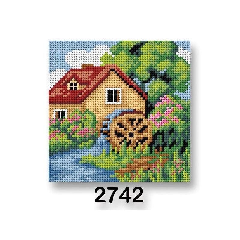 Vyšívací předloha s motivem mlýnu mezi zelenými stromy. Předloha na vyšívání ze 100% bavlny je vhodná zejména na křížkový steh, nejlépe při použití přízí mouline (mulinka), které na výšivce nejlépe vyniknou. Obrázek na vyšívání má rozměr 15 x 15 cm.