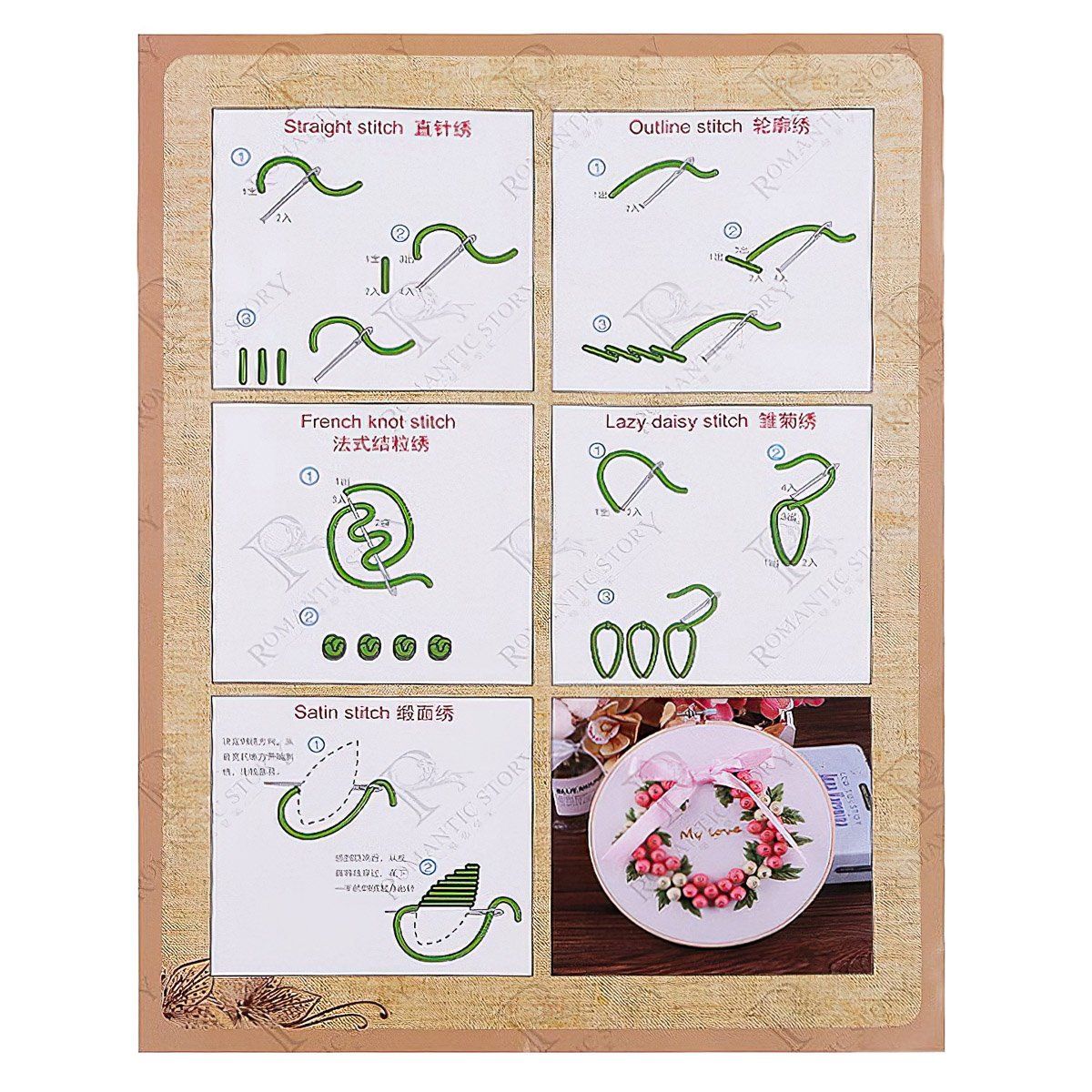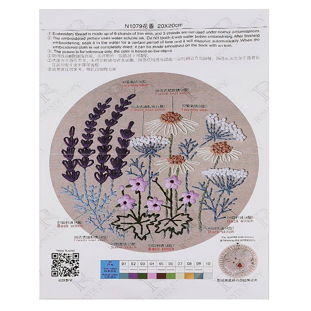 Sada na vyšívání s motivem modrých, vínových a žlutých květů na béžovém podkladu. Vyšívá se na předtištěnou tkaninu pomocí příze mouline (mulinka). Vyšívací sada obsahuje vyšívací tkaninu s předlohou, sadu barevných přízí, obrázkový návod, vyšívací jehly a dřevěný, bambusový vyšívací kruh o průměru 20,2cm, který použijete jako rámeček pro hotový obrázek.