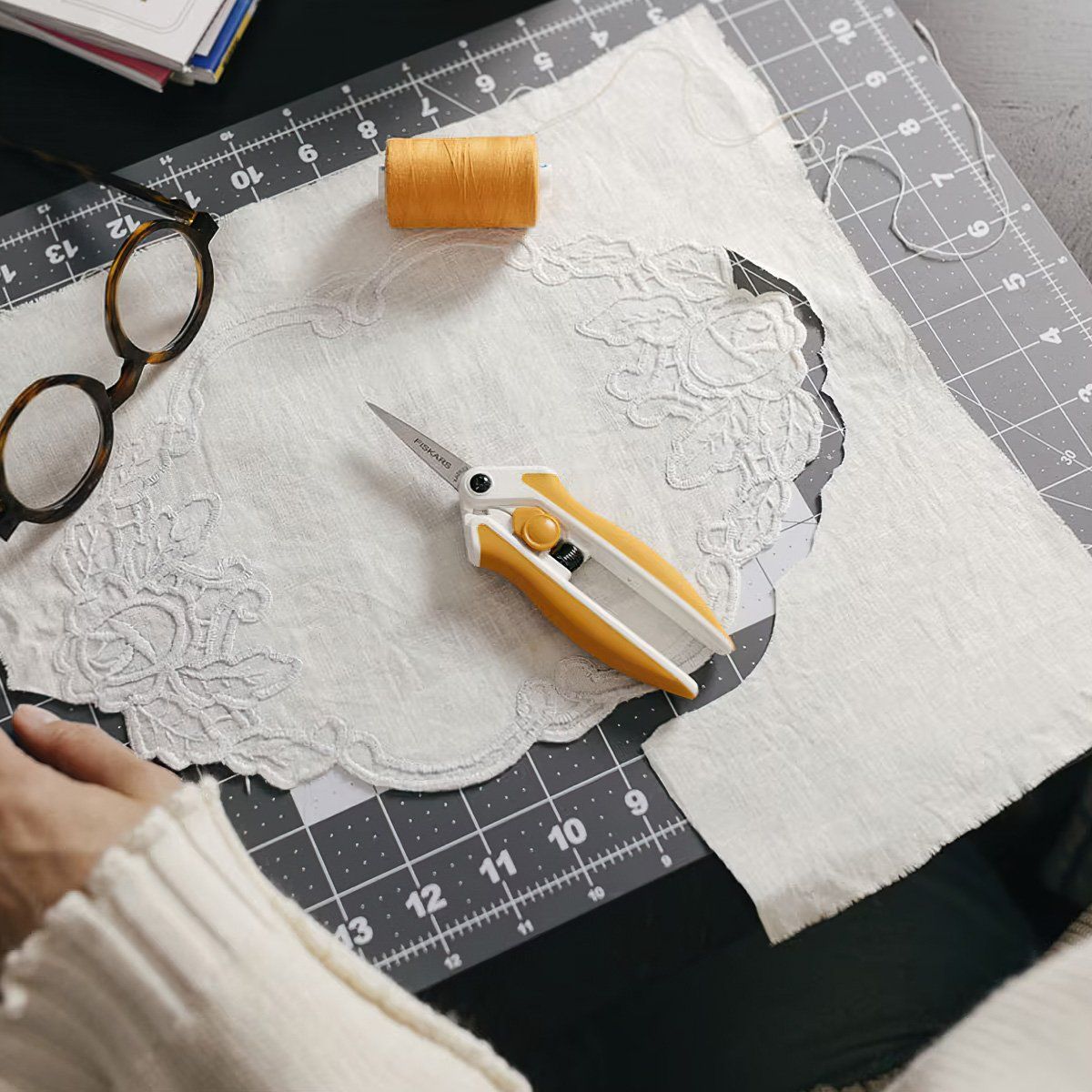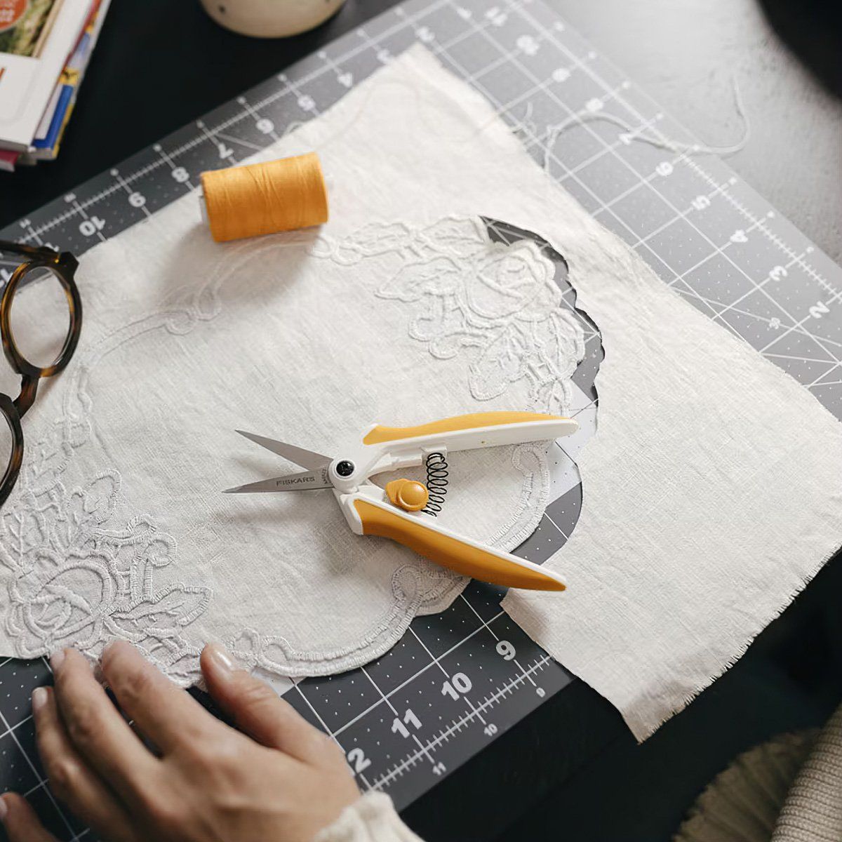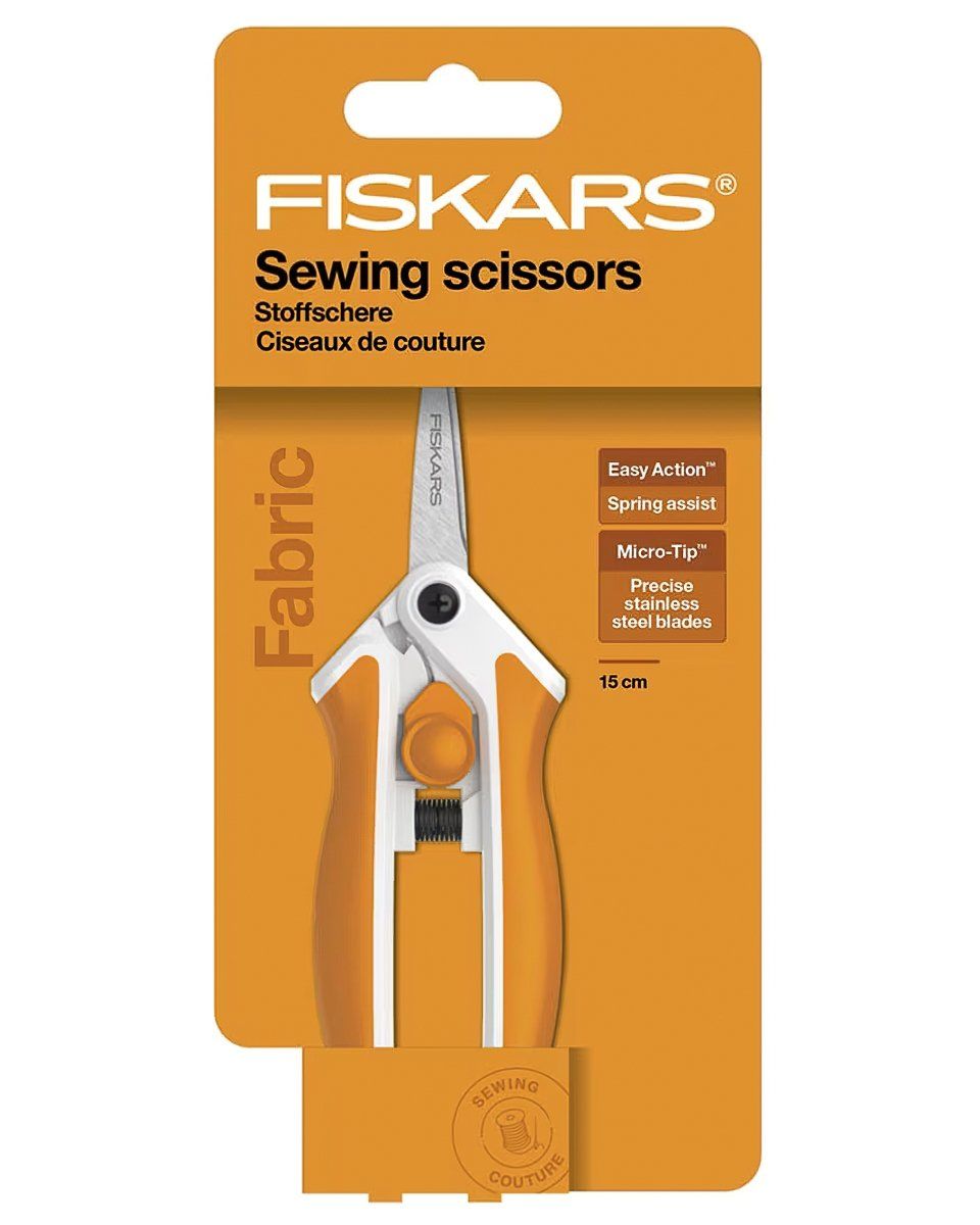 Pružinové nůžky na nitě Fiskars Premier EasyAction mají velmi ostré čepele Micro-Tip™ pro rychlé odstřihování nití, pár...