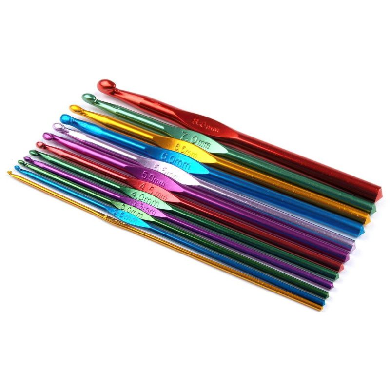 Sada hliníkových háčků na háčkování v délce 15 cm. Souprava obsahuje 12 různobarevných háčků o velikostech 2; 2,5; 3; 3,5; 4; 4,5; 5; 5,5; 6; 6,5; 7 a 8 mm. Háček s nejnižším číslem je nejslabší, s nejvyšším naopak nejsilnější. Doporučená velikost háčku je obvykle uvedena na obalu každé příze....
