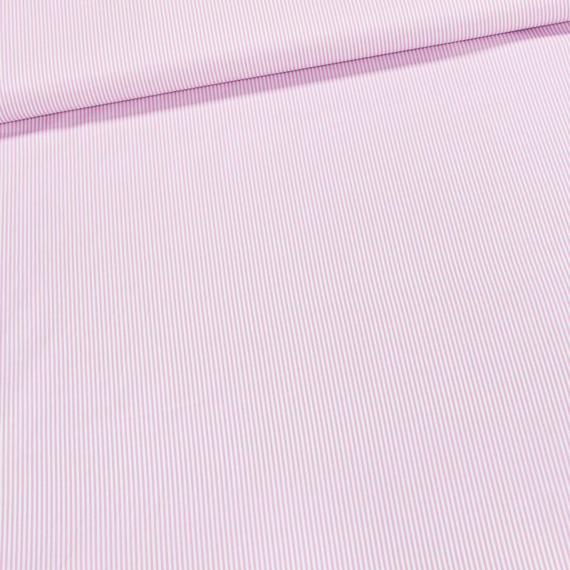 Bavlněná látka košilovina se vzorem tenkého růžovo-bílého proužku. Látka je v hladkém provedení a je vhodná na výrobu košil, letních šatů, sukní, halenek, košilových šatů či lehkých kalhot. Látka je v šířce 150 cm, vyrobena ze 100% bavlny (115g/m). Látka je z obou stran stejná.