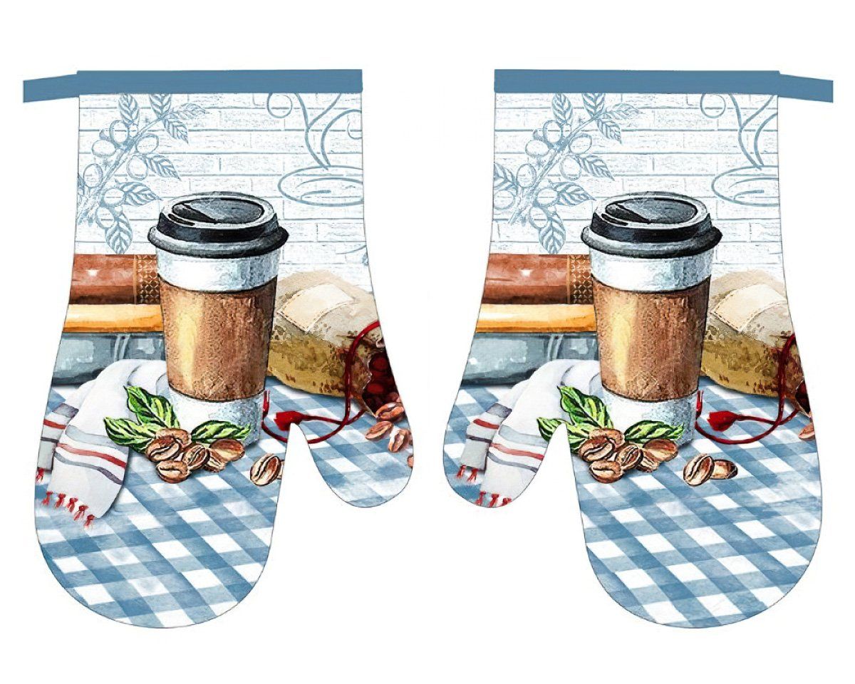 Kuchyňská chňapka (rukavice) se vzorem kávy v kombinaci s modrým kárem. Chňapka má našité poutko na zavěšení i uvnitř všitý magnet. Chňapka je v rozměru 27x18cm a je vyrobena ze 100% polyesteru s výplní ze 100% polypropylenu. Balení obsahuje 2 kusy chňapek na levou a pravou ruku.