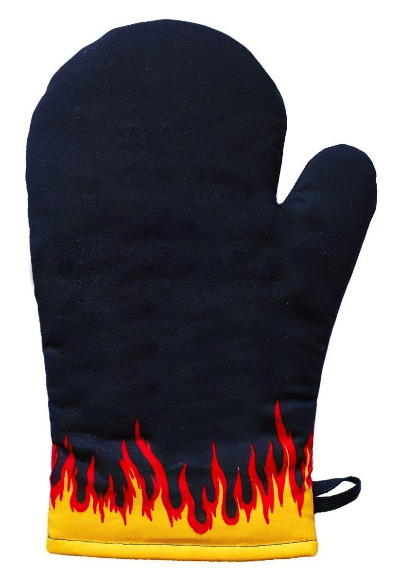 Kuchyňská chňapka (rukavice) v černé barvě ze spodním lemem, který tvoří plameny. Chňapka má všitý magnet a poutko na zavěšení. Chňapka je v rozměru 28x18cm a je vyrobena ze 100% bavlny s výplní ze 100% polyesteru (rouno z dutého vlákna).