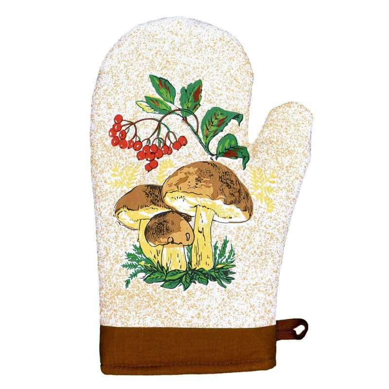 Kuchyňská chňapka (rukavice) s kuchyňským oboustranným vzorem hříbků v hnědém provedení. Chňapka má všitý magnet a poutko na zavěšení. Chňapka je v rozměru 28x18cm a je vyrobena ze 100% bavlny s výplní ze 100% polyesteru (rouno z dutého vlákna).