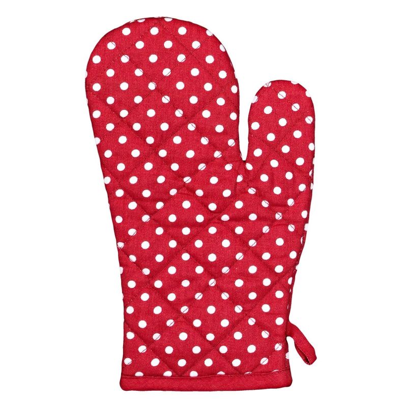 Kuchyňská chňapka (rukavice) se vzorem bílých puntíků na červeném podkladu. Chňapka má poutko na zavěšení. Chňapka je v rozměru 28x18cm a je vyrobena ze 100% bavlny s výplní ze 100% polyesteru (rouno z dutého vlákna).
