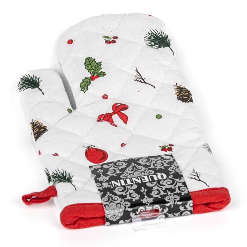 Kuchyňská chňapka (rukavice) se vzorem šišek, baněk a mašliček na bílém podkladu. Chňapka má poutko na zavěšení. Chňapka je v rozměru 28x18cm a je vyrobena ze 100% bavlny s výplní ze 100% polyesteru (rouno z dutého vlákna).