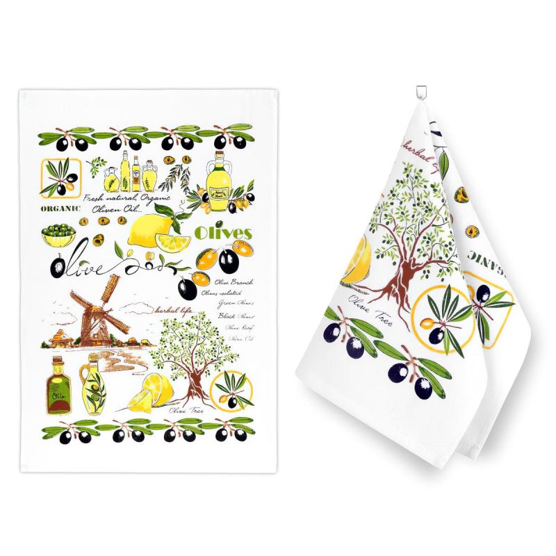 Froté kuchyňská utěrka ze 100% bavlny (gramáž 350g/m2) v rozměru 40x60cm se vzorem oliv a citronu v zeleno-žlutých barvách na bílém podkladu. Utěrka je z lícové strany v hladkém provedení, z rubové strany má provedení froté. Froté utěrky dobře absorbují vodu, dokonale s nimi utřete jakýkoliv mokrý povrch.