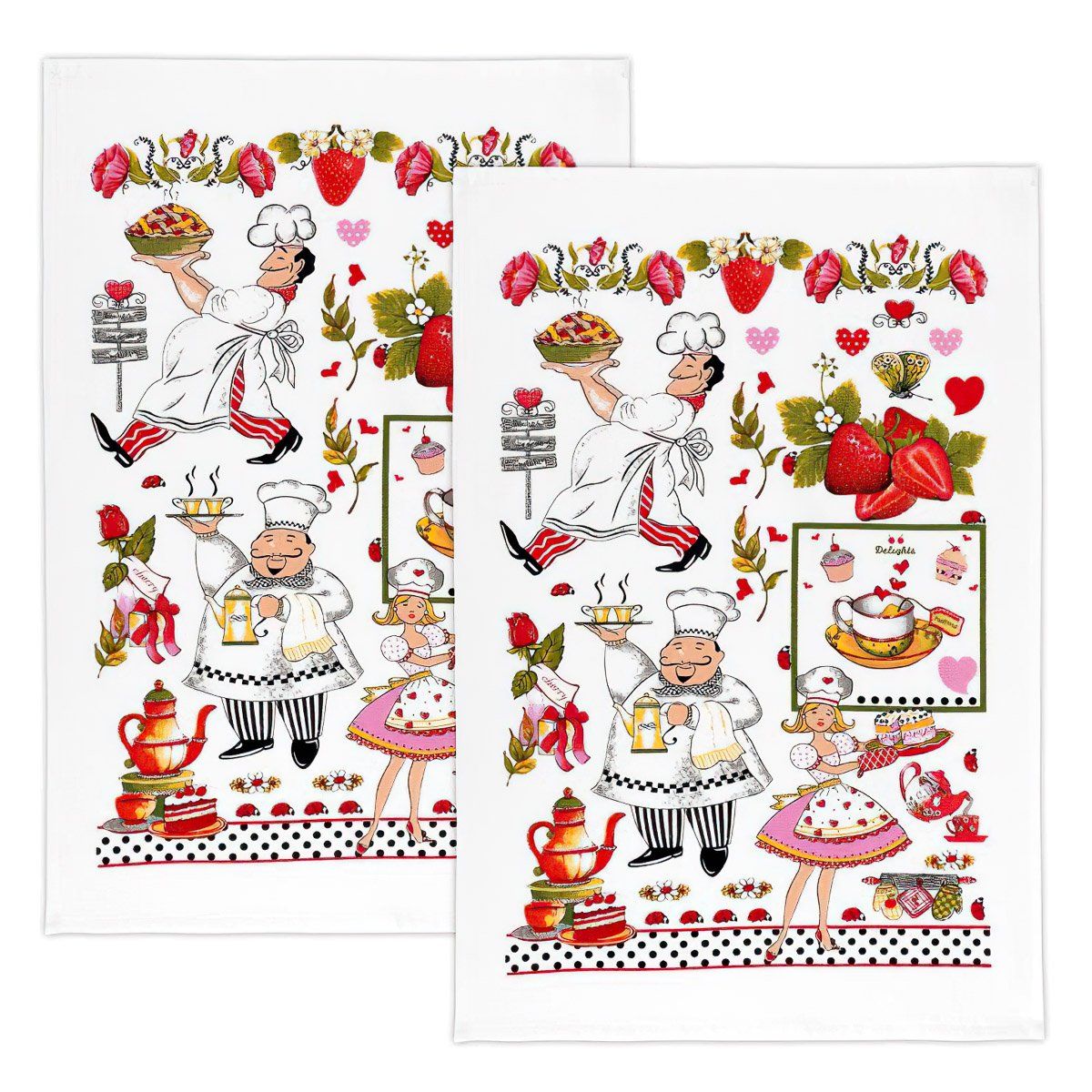 Froté kuchyňská utěrka ze 100% bavlny (gramáž 350g/m2) v rozměru 40x60cm se vzorem kuchaře, kuchařky a jahod v červených...