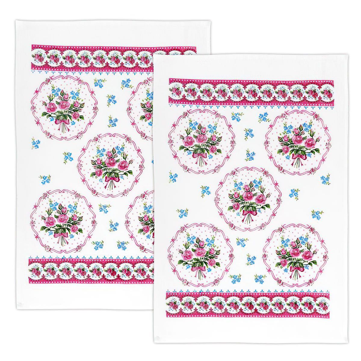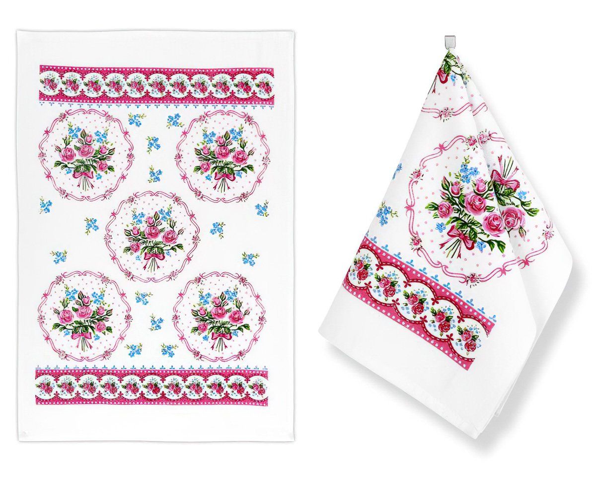 Froté kuchyňská utěrka ze 100% bavlny (gramáž 350g/m2) v rozměru 40x60cm se vzorem růžových a modrých květin na bílém podkladu. Utěrka je z lícové strany v hladkém provedení, z rubové strany má provedení froté. Froté utěrky dobře absorbují vodu, dokonale s nimi utřete jakýkoliv mokrý povrch.