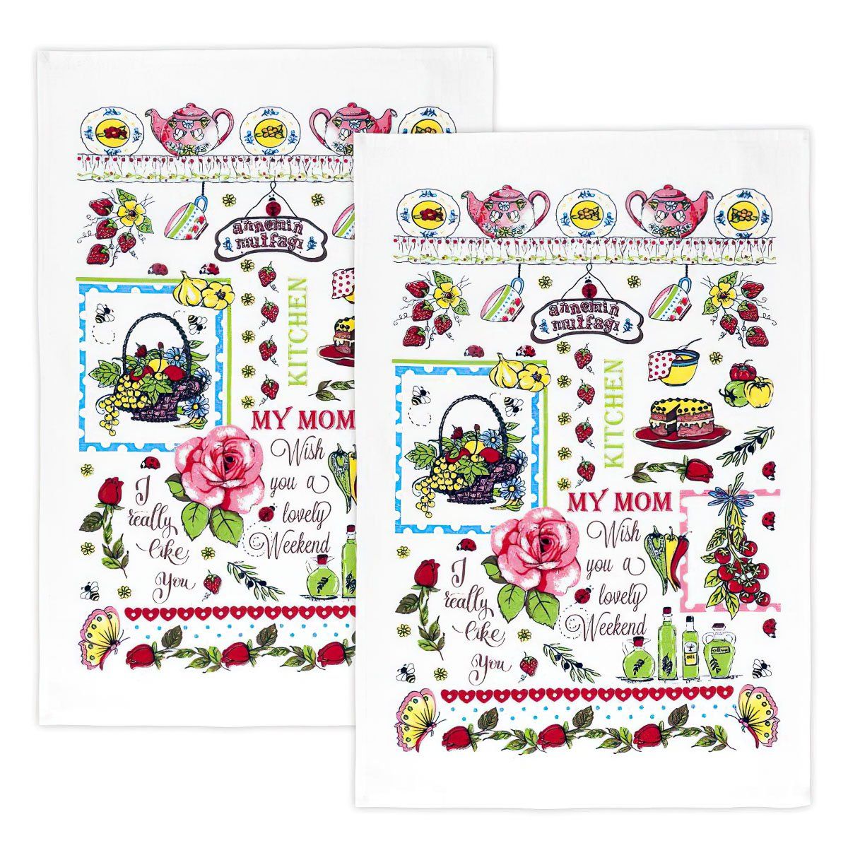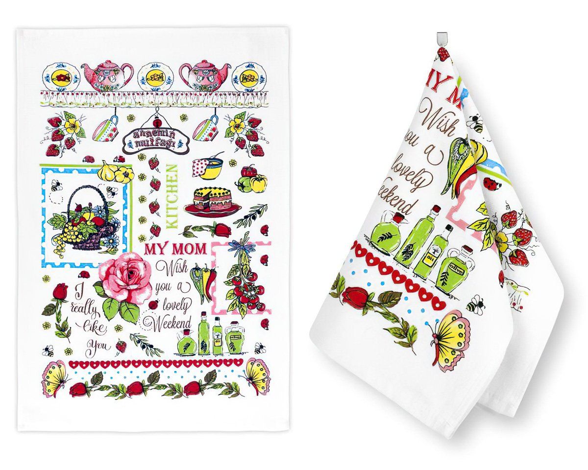 Froté kuchyňská utěrka ze 100% bavlny (gramáž 350g/m2) v rozměru 40x60cm se vzorem růže a kuchyňských potřeb na bílém po...