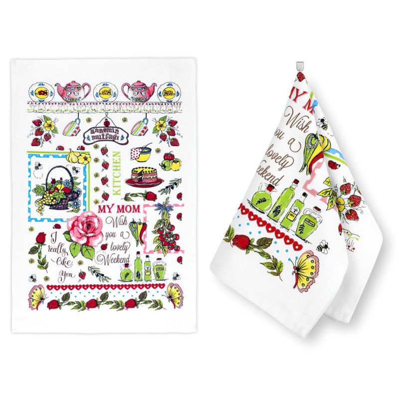 Froté kuchyňská utěrka ze 100% bavlny (gramáž 350g/m2) v rozměru 40x60cm se vzorem růže a kuchyňských potřeb na bílém podkladu. Utěrka je z lícové strany v hladkém provedení, z rubové strany má provedení froté. Froté utěrky dobře absorbují vodu, dokonale s nimi utřete jakýkoliv mokrý povrch.