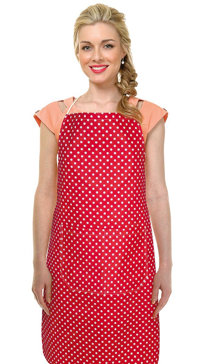 Kuchyňská zástěra vyrobená v kombinaci 70 % bavlna, 30 % polyester se vzorem bílých puntíků na červeném podkladu. Zástěra má rozměr 67x84cm, a je tak vhodná na každou postavu. Opatřena je praktickou velkou kapsou uprostřed.