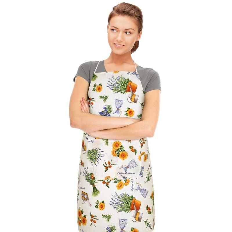 Kuchyňská zástěra vyrobená v kombinaci 70 % bavlna, 30 % polyester se vzorem levandule a žlutých slunečnic. Zástěra má rozměr 67x84cm, a je tak vhodná na každou postavu. Opatřena je praktickou velkou kapsou uprostřed.