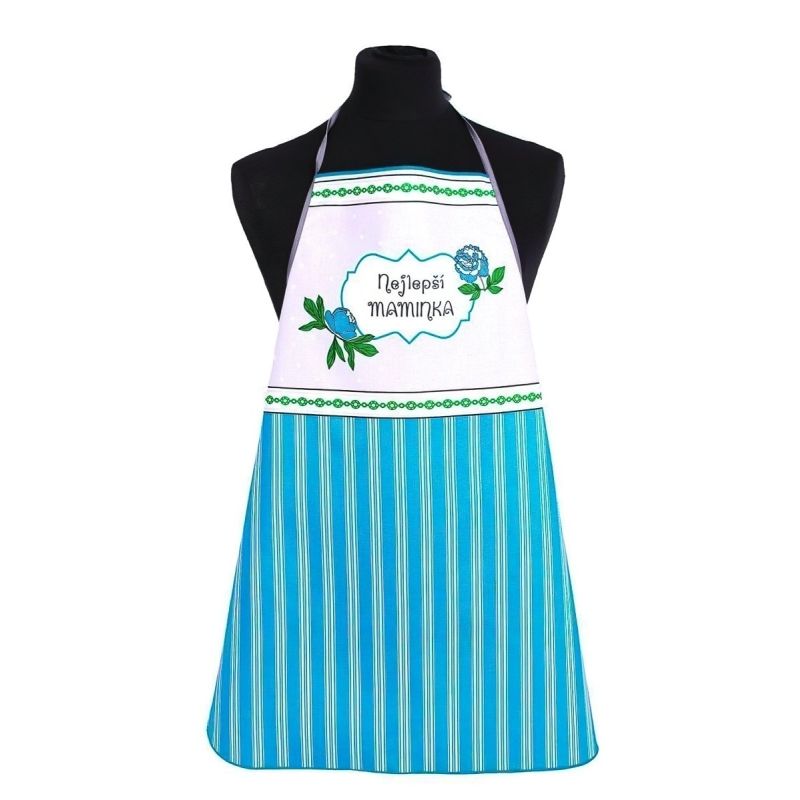 Kuchyňská zástěra je vyrobena ze 100% bavlny v univerzální velikosti se vzorem tyrkysových proužků a nápisu nejlepší maminka.