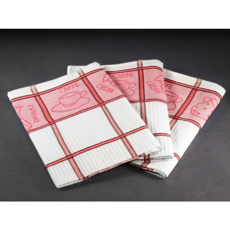 Souprava tří kusů kuchyňských utěrek z exkluzivní egyptské bavlny v rozměru 50x70cm v červeno-bílém káru se vzorem hrníčků.