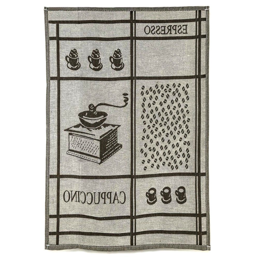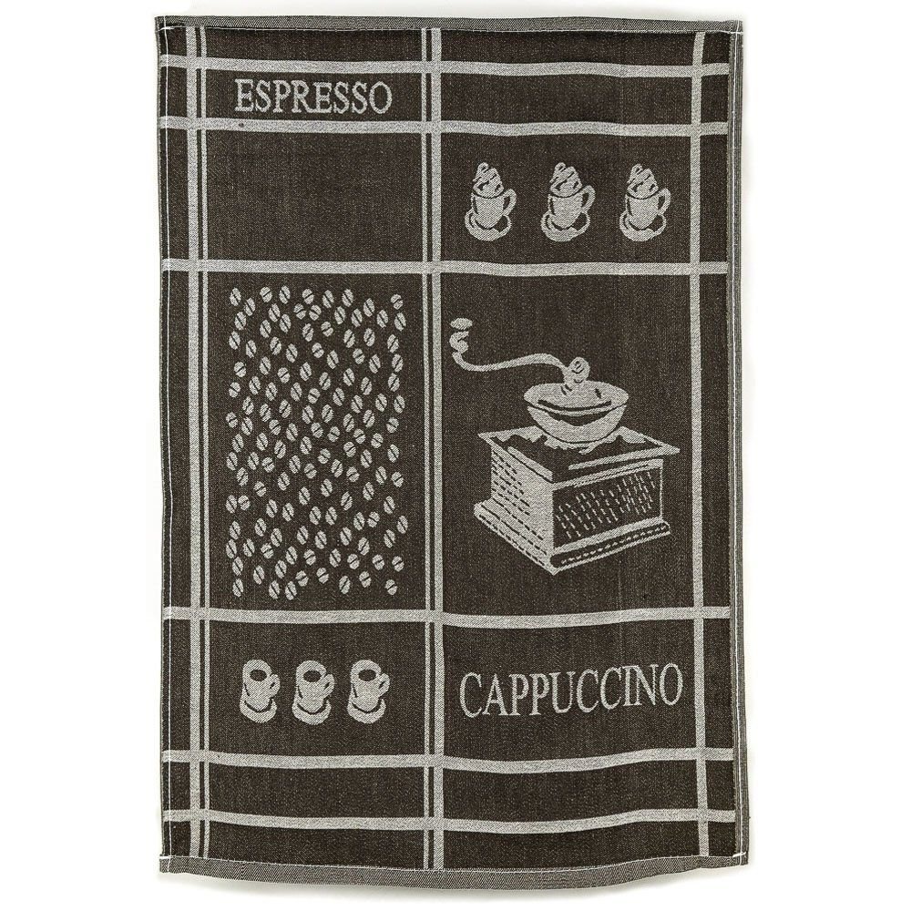 Souprava tří kusů kuchyňských utěrek z exkluzivní egyptské bavlny v rozměru 50x70cm v přírodní tmavě hnědé barvě se světle béžovým kávovým motivem. Z druhé strany jsou barvy obráceně.