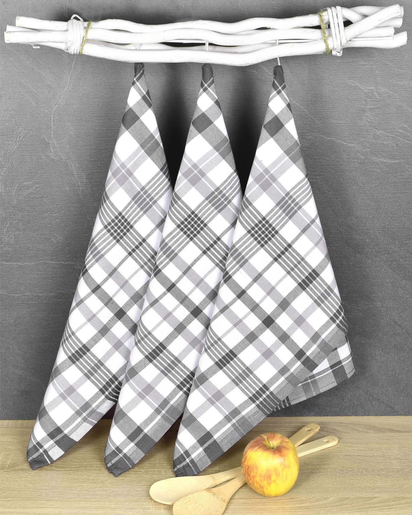 Souprava tří kusů kuchyňských utěrek z exkluzivní egyptské bavlny v rozměru 50x70cm se vzorem šedého kára. Utěrky z egyp...