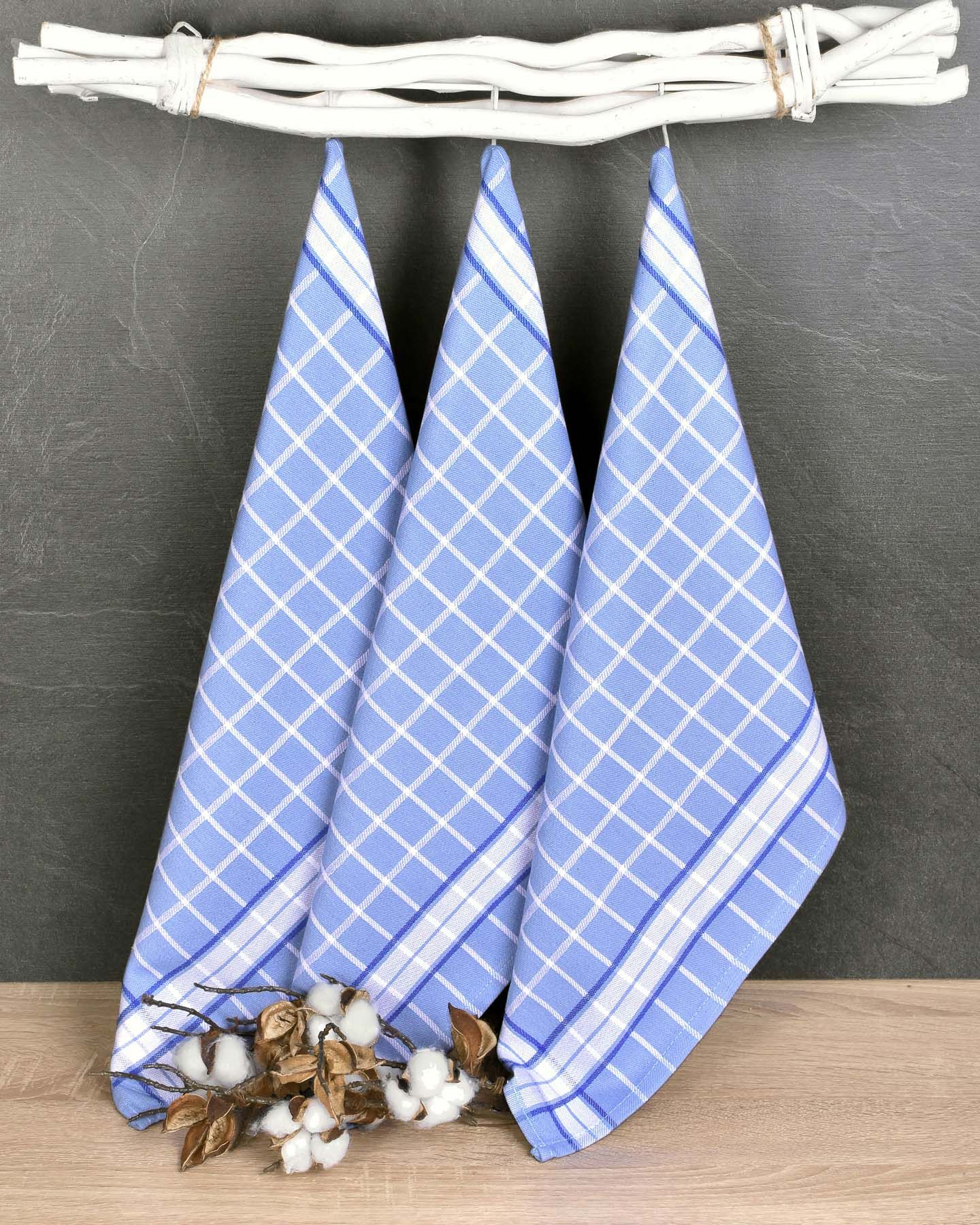 Souprava tří kusů kuchyňských utěrek z exkluzivní egyptské bavlny v rozměru 50x70cm se vzorem modro-bílé kostky. Utěrky ...