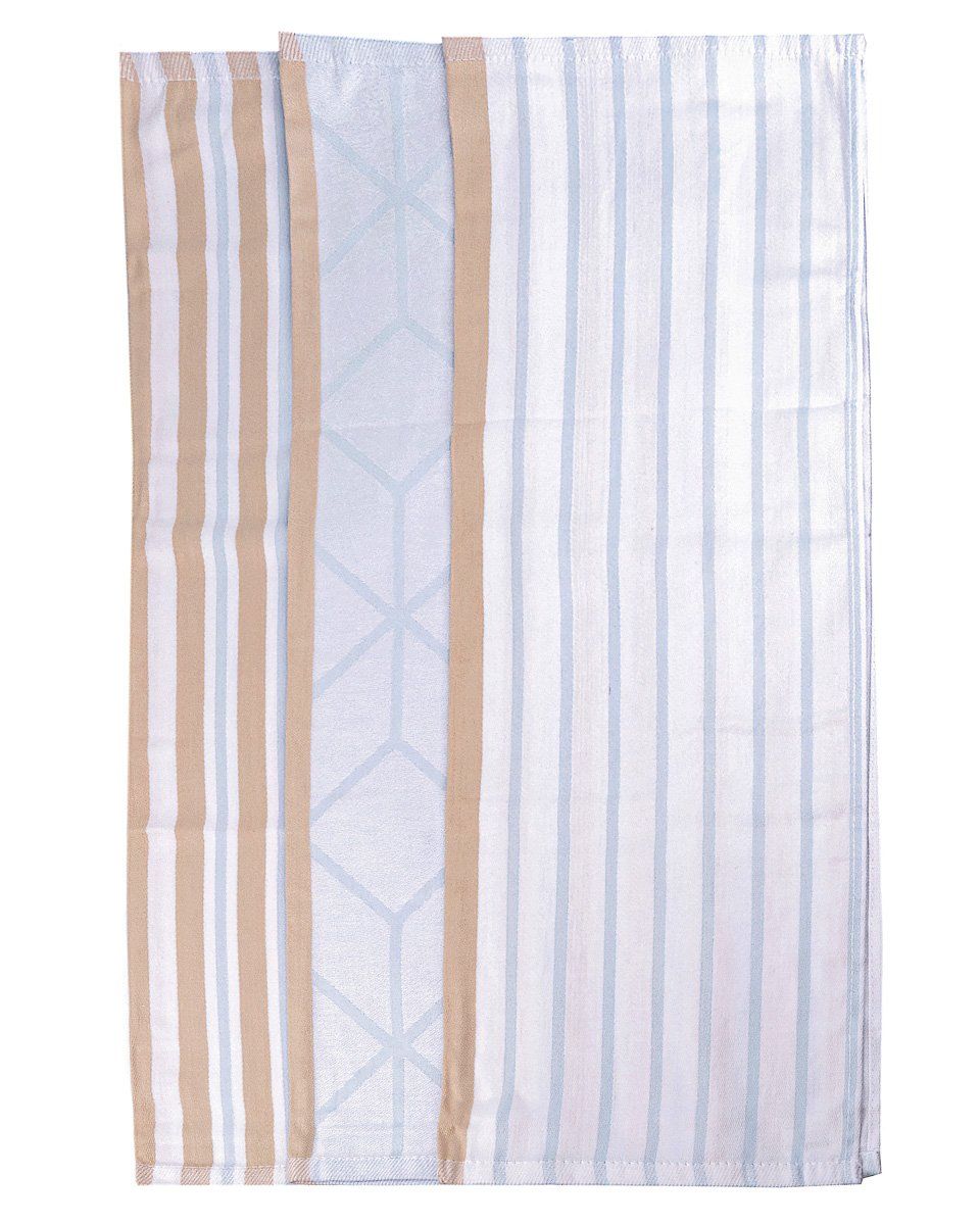 Souprava tří kusů kuchyňských utěrek z exkluzivní egyptské bavlny v rozměru 50x70cm se vzorem proužku a geometrického vzoru v béžové a světle modré barvě.
