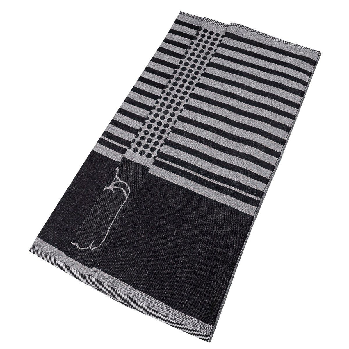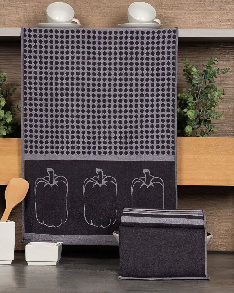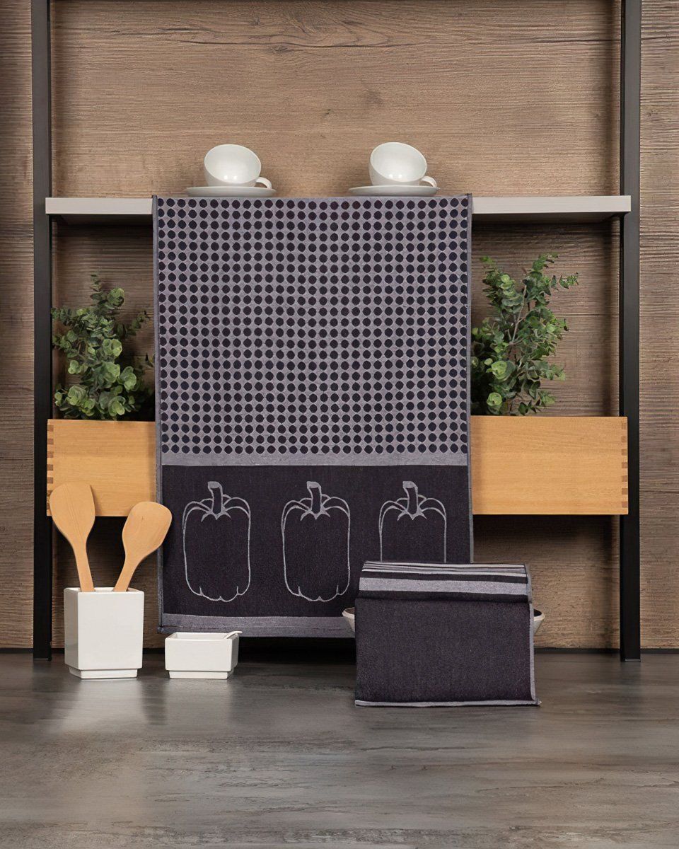Souprava tří kusů kuchyňských utěrek z exkluzivní egyptské bavlny v rozměru 50x70cm se vzorem proužků a papriky v černé barvě.