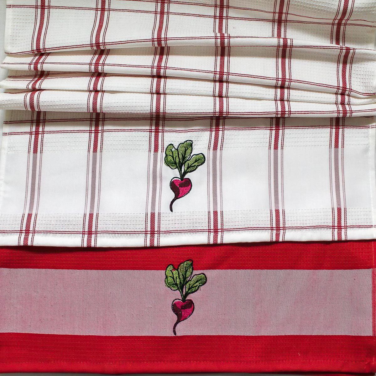 Vaflové utěrky s motivem ředkvičky na bílém podkladu s červeným kárem. Balení obsahuje 2 kusy barevně sladěných utěrek v rozměru 45x70cm. Utěrky jsou vyrobeny z 95% bavlny a 5% polyesteru.