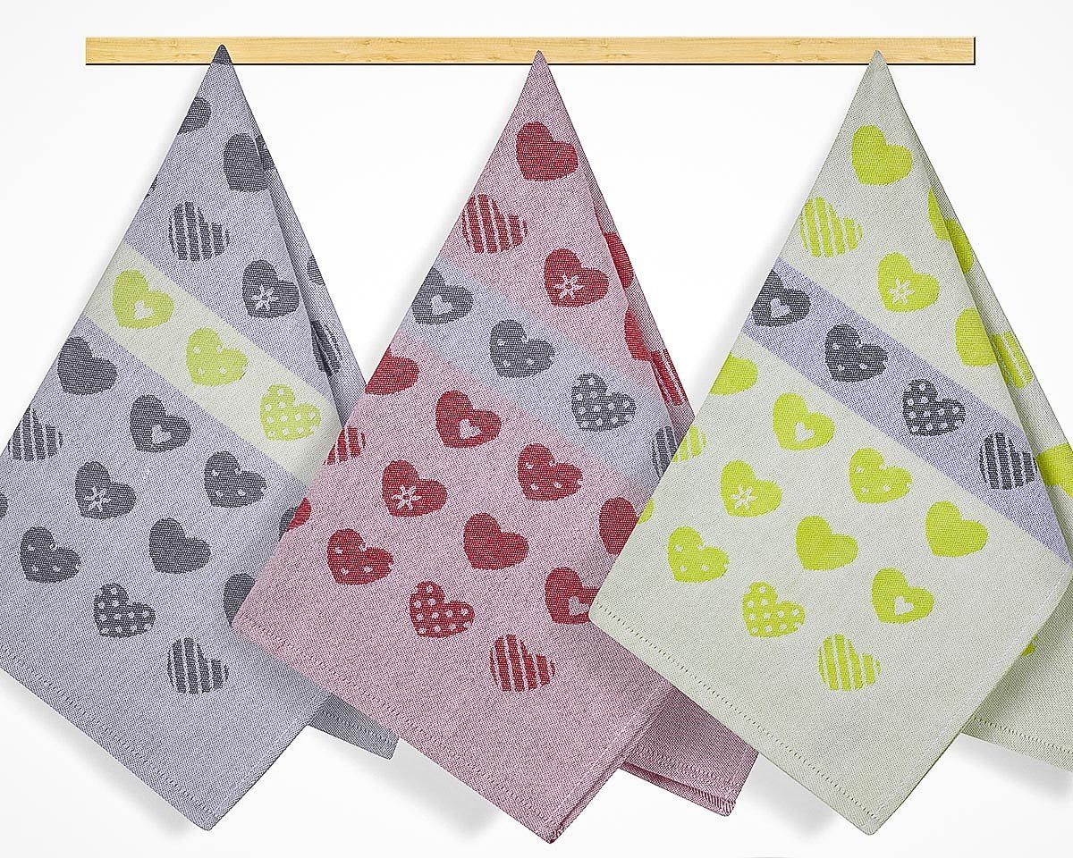 Souprava tří kusů kuchyňských utěrek ze 100% bavlny v rozměru 50x70cm s motivem srdíček v šedém, červeném a zeleném provedení.