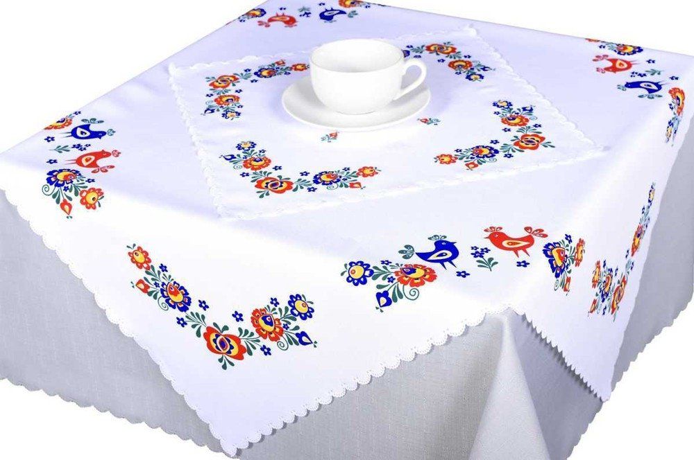 Kuchyňská prostírka s tradičním venkovským vzorem květů a ptáčků v červeném provedení na bílém podkladu s ozdobným lemem je vyrobena ze 100 % polyesteru ve čtvercovém rozměru 35x35cm.