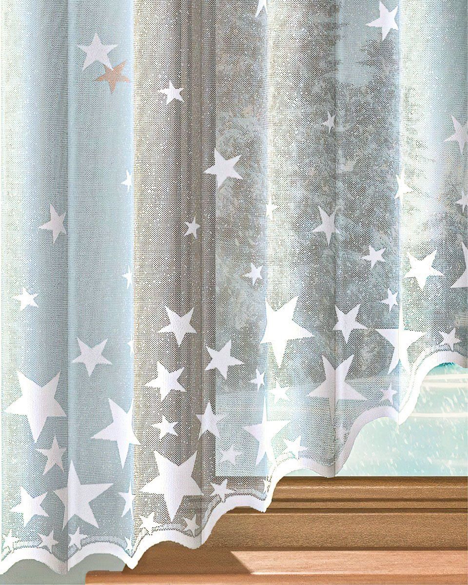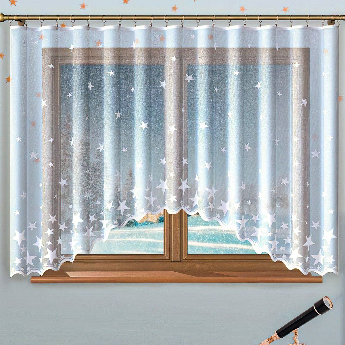 Hotová jemná žakárová záclona s vánočním vzorem hvězdiček v jednobarevné bílé barvě. Záclona je vyrobena ze 100% polyesteru v různých výškách a šířkách. Záclona má z výroby pevné boční i horní okraje, bez řasící stužky. Výška záclony je měřena v nejdelším místě.
