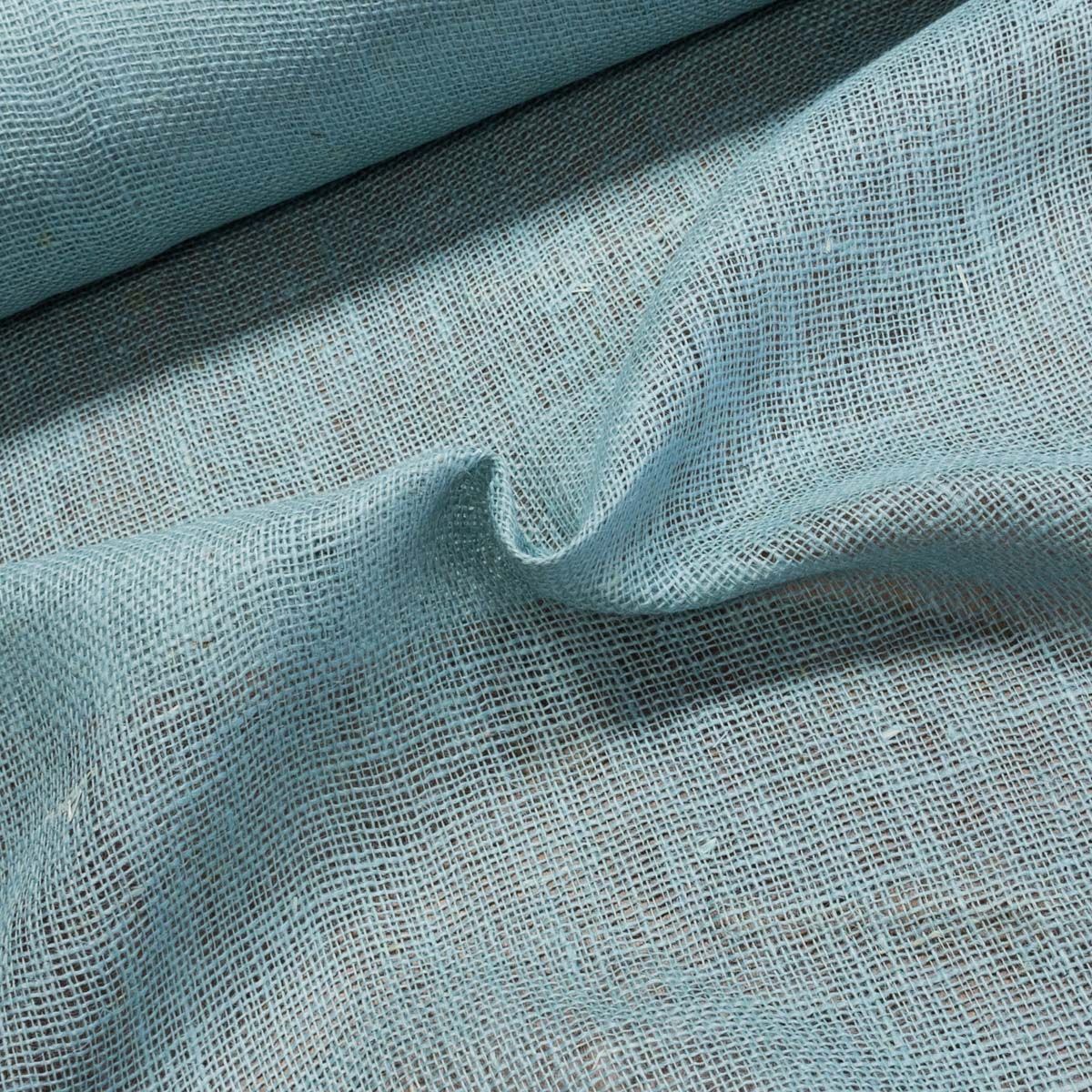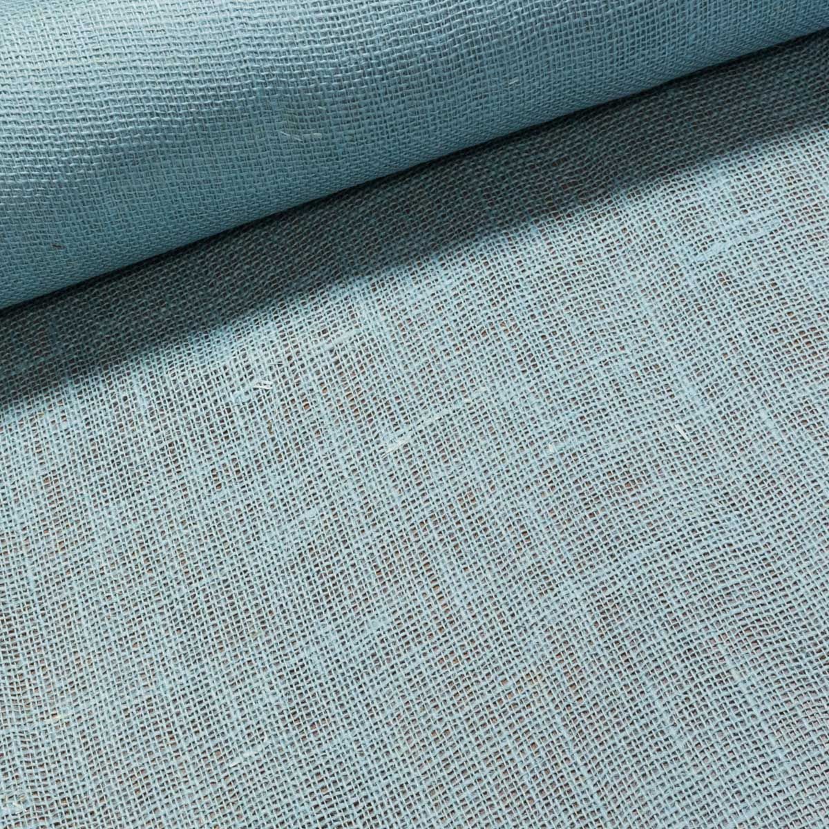 Juta (pytlovina) v jednobarevné světle modré barvě. Přírodní jutu lze využít jako dekorační látku (pytle, dárkové pytlíč...