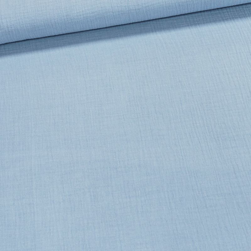Látka fáčovina (gázovina, mušelín) v jednobarevné světle modré barvě. Látka je lehká vhodná na výrobu šatů, sukní, halenek, košilí, košilových šatů či lehkých kalhot. Látka je v šířce 135 cm, vyrobena ze 100% bavlny (115g/m). Látka je z obou stran stejná.