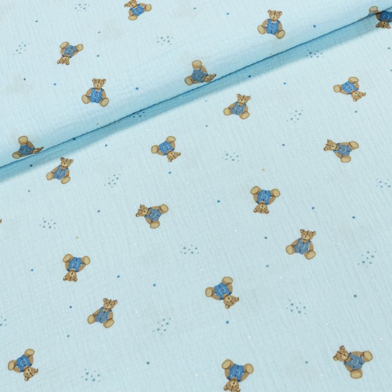 Bavlněná látka (šatovka) mušelín nebo také fáčovina se vzorem medvídků na modrém podkladu v krešovaném provedení. Látka je vhodná na výrobu šatů, sukní, halenek, košilí, košilových šatů . Látka je v šířce 135 cm, vyrobena ze 100% bavlny (125g/m). Látka má vzor jen z jedné strany z druhé strany je bez potisku.