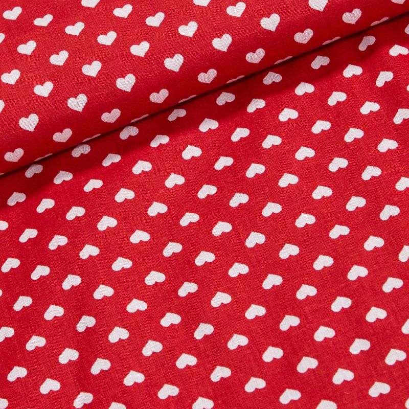 Bavlněná látka (tkanina) s motivem bílých srdíček na červené. Látka je v šířce 140 cm, vyrobena ze 100% bavlny (gramáž 135g/m2) v plátnové vazbě. Vzor látky je natištěn jen z jedné strany z druhé strany je látka bez potisku.