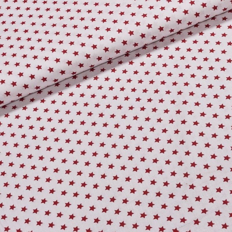 Bavlněná látka (tkanina) se vzorem červených hvězdiček na bílém podkladu. Látka je v šířce 140 cm, vyrobena ze 100% bavlny (gramáž 135g/m2) v plátnové vazbě a vzor je jen z jedné strany z druhé strany je látka bez potisku.