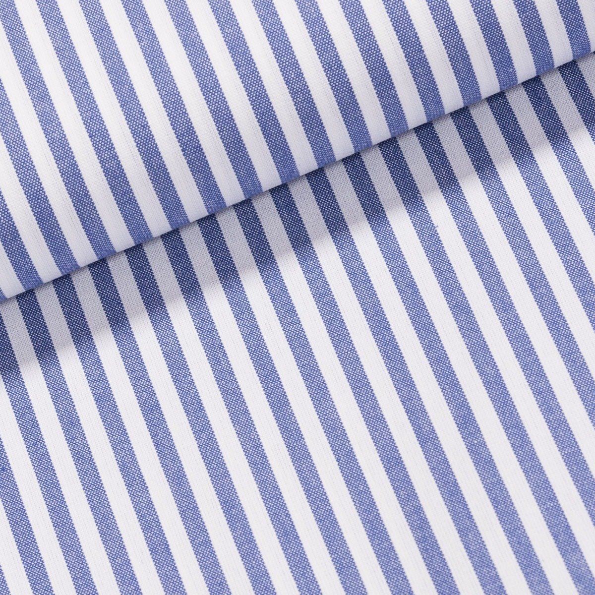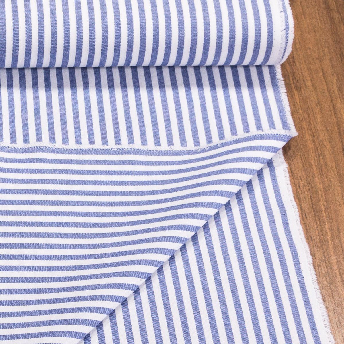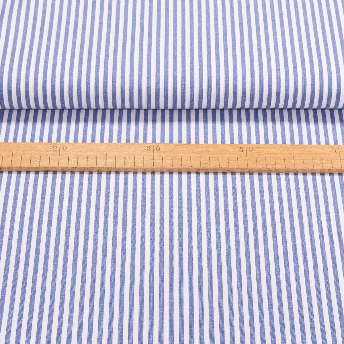 Bavlněný kanafas od českého výrobce proužkovaný, pestře tkaný (0,5cm) v riflově modré barvě. Látka je v šířce 140 cm, vyrobena ze 100% bavlny (gramáž 177g/m2) v plátnové vazbě. Vzor látky je vytkávaný, a je tedy z obou stran stejný.