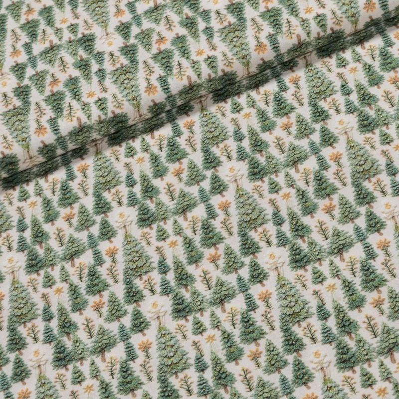 Bavlněná látka (tkanina) se vzorem zelených stromečků. Látka je v šířce 150 cm, vyrobena ze 100% bavlny (gramáž 120g/m2) v jemné plátnové vazbě. Vzor látky je natištěn jen z jedné strany z druhé strany je látka bez potisku.