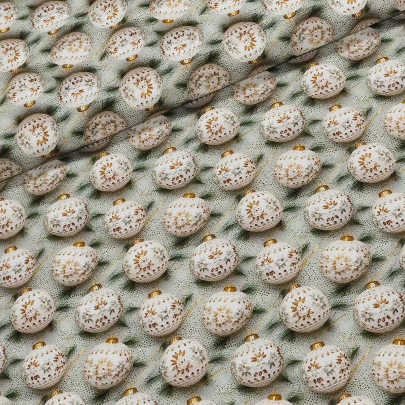Bavlněná látka (tkanina) se vzorem bílo-zlatých baněk s větvičkami na podkladu s bílou krajkou. Látka je v šířce 150 cm, vyrobena ze 100% bavlny (gramáž 120g/m2) v jemné plátnové vazbě. Vzor látky je natištěn jen z jedné strany z druhé strany je látka bez potisku.
