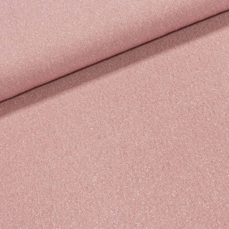 Elastický polyesterový úplet (jersey) v jednobarevné starorůžové barvě se třpytkami. Je vyroben z 95% polyester a 5% elastanu (gramáž 213g/m2). Látka je v šířce 140 cm. Úplet je díky lesklému provedení vhodný na společenské oblečení jako jsou šaty, sukně, kardigany, topy či oděvní doplňky. Látka je z rubové strany matná.