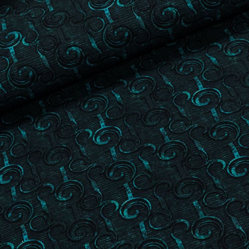 Elastický úplet (jersey) s tyrkysovým vzorem na tyrkysovo-černém žíhaném podkladu. Látka je v šířce 145 cm, vyrobena ze 95% bavlny a 5% elastanu (gramáž 250g/m2). Látka je vhodná na tepláky, elasťáky, šaty, sukně, mikiny, čepice či nákrčníky. Látka má vzor z jedné strany z druhé strany je bez potisk...