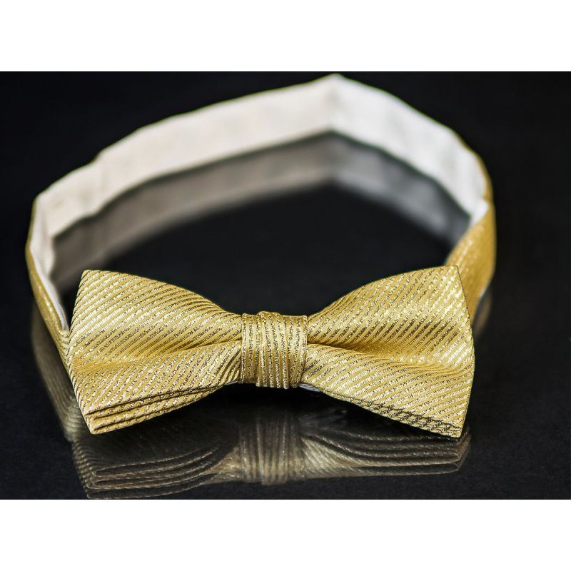 Elegantní, ručně šitý pánský motýlek zlaté barvy se vzorem stříbrných proužků, vyrobený ze 100% polyesteru. Motýlek je již uvázaný, zapínání na sponu. Šířka motýlku v nejširším místě je 11,5 cm a vysoký 5,5 cm v nejdelším místě. Díky své univerzální barvě je tento motýlek vhodný na taneční a jiné společenské události označené jako "Black Tie" nebo "Ultra Formal", kde je smoking nebo frak nutností.
