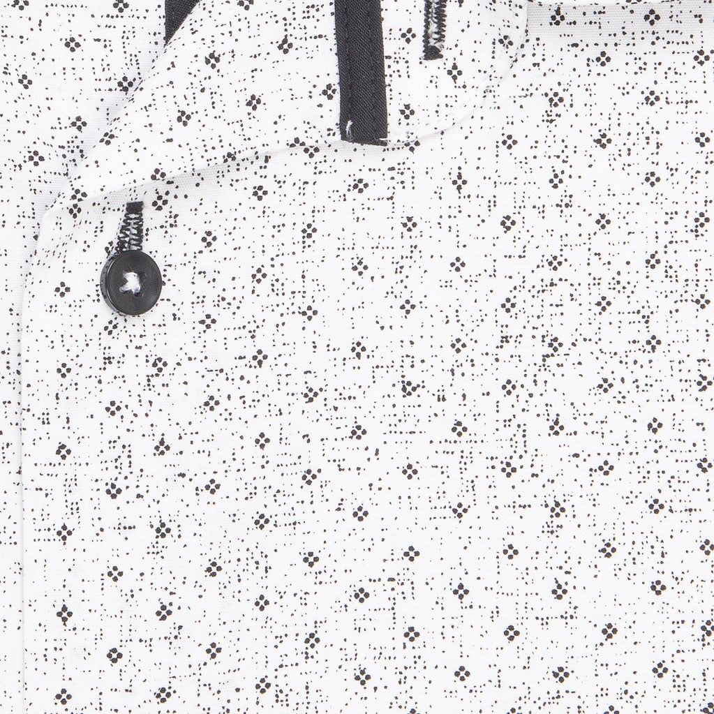 Pánská vzorovaná košile AMJ Comfort s krátkým rukávem. Pánská košile je v bílé barvě se vzorem černého kropení s černými doplňky. Košile se hodí jak do zaměstnání, tak na běžné nošení i do společnosti. V této košili Vám bude velmi příjemně díky použití kvalitního materiálu (95% bavlny 5% spandex).