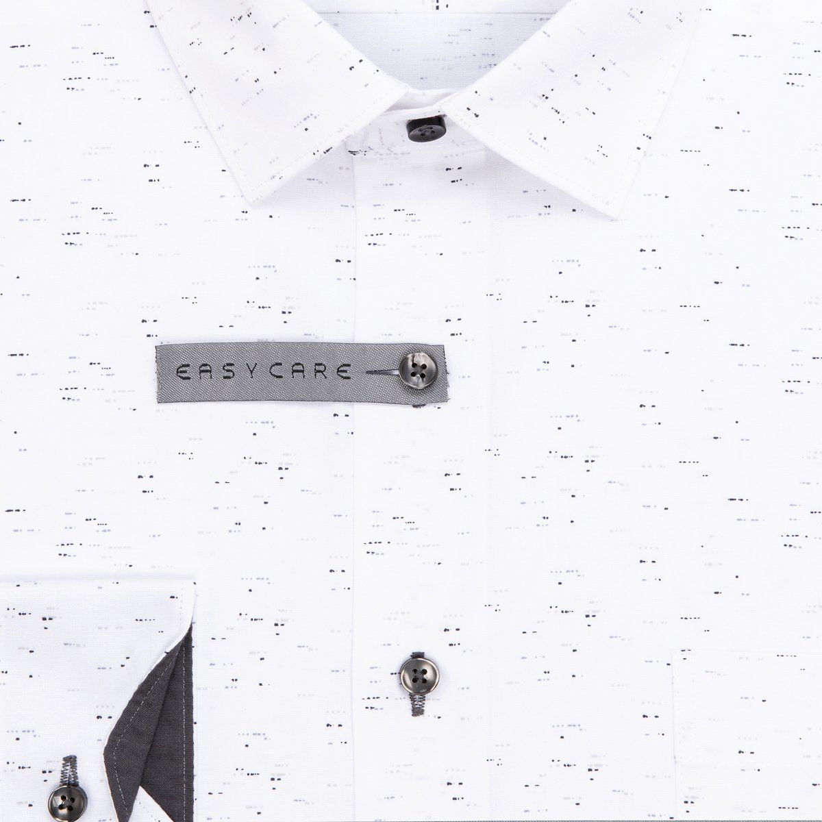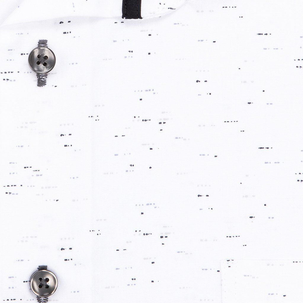 Pánská vzorovaná košile AMJ Comfort s dlouhým rukávem. Pánská košile v bílé barvě se vzorem černých a šedých teček tvořící žíhání s tmavě šedými doplňky. Košile se hodí jak do zaměstnání, tak na běžné nošení i do společnosti. V této košili Vám bude velmi příjemně díky použití kvalitního materiálu (95% bavlna, 5% spandex).