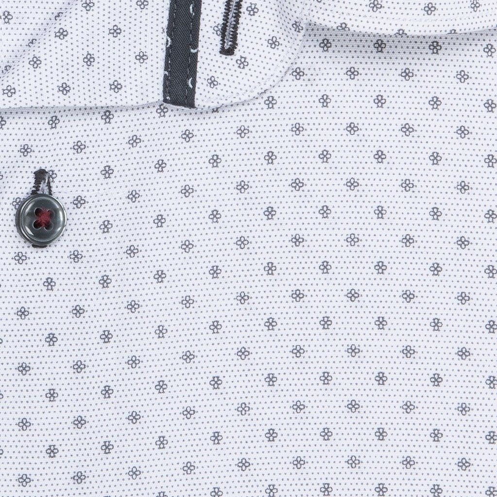 Pánská vzorovaná košile AMJ Comfort s krátkým rukávem. Pánská košile je v bílé barvě se vzorem drobných kytiček s černými doplňky. Košile se hodí jak do zaměstnání, tak na běžné nošení i do společnosti. V této košili Vám bude velmi příjemně díky použití kvalitního materiálu (95% bavlny 5% spandex).