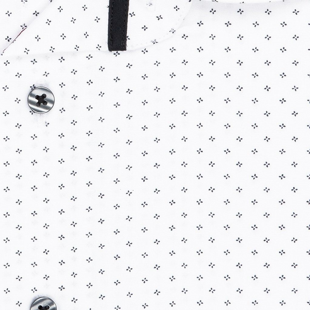 Pánská vzorovaná košile AMJ Comfort s krátkým rukávem. Pánská košile je v bílé barvě se vzorem drobných černých puntíků tvořící čtverečky s černými doplňky. Košile se hodí jak do zaměstnání, tak na běžné nošení i do společnosti. V této košili Vám bude velmi příjemně díky použití kvalitního materiálu (95% bavlny 5% spandex).