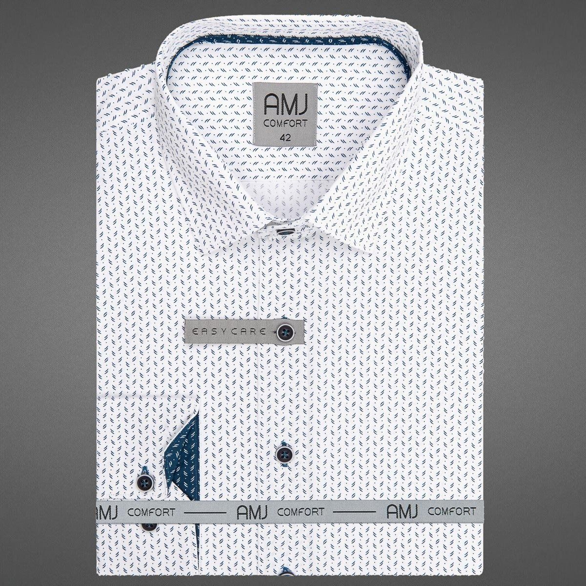 Pánská vzorovaná košile AMJ Comfort s dlouhým rukávem. Pánská košile je v světle modré barvě se vzorem dvojitých bílých vlnek a bílými doplňky. Košile se hodí jak do zaměstnání, tak na běžné nošení i do společnosti. V této košili Vám bude velmi příjemně díky použití kvalitního materiálu (95% bavlna, 5% spandex).