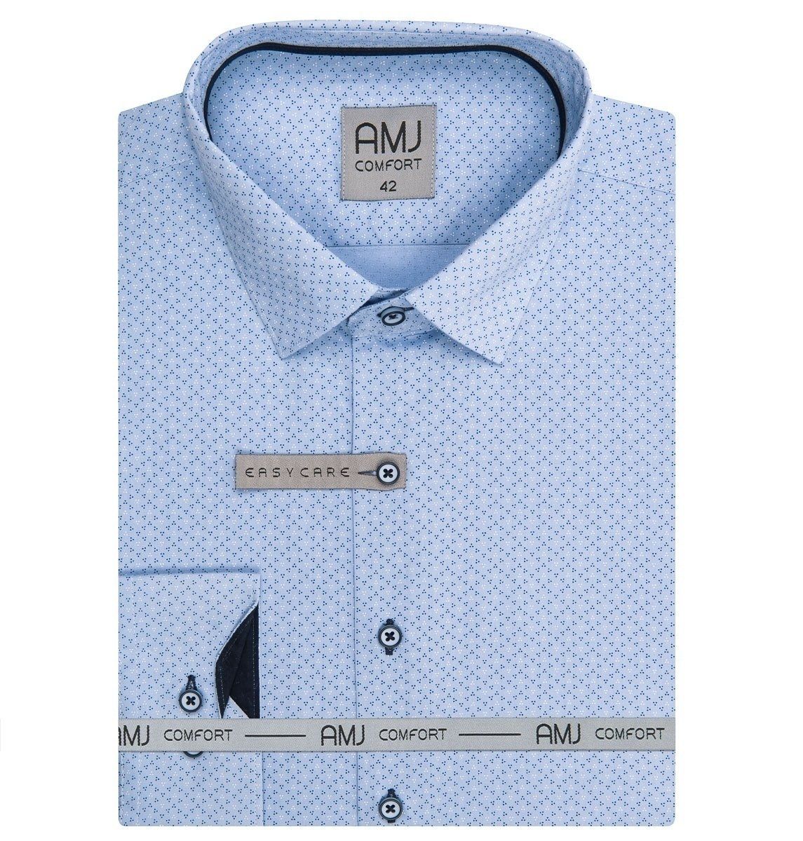 Pánská vzorovaná košile AMJ Comfort s dlouhým rukávem. Pánská košile v světle modré barvě se vzorem bílých a modrých teč...
