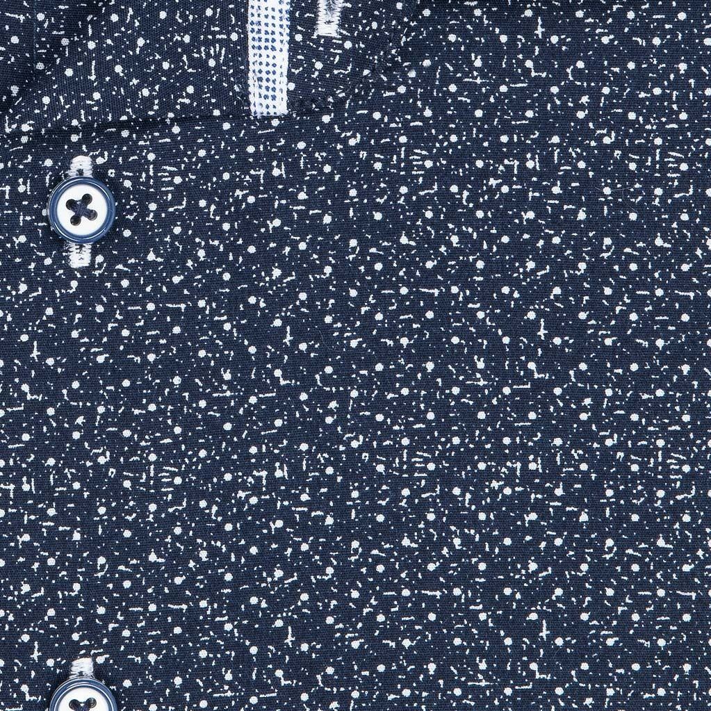 Pánská vzorovaná košile AMJ Comfort s krátkým rukávem. Pánská košile je v tmavě modré barvě se vzorem drobných bílých skvrn a puntíků s bílými doplňky. Košile se hodí jak do zaměstnání, tak na běžné nošení i do společnosti. V této košili Vám bude velmi příjemně díky použití kvalitního materiálu (95% bavlny 5% spandex).