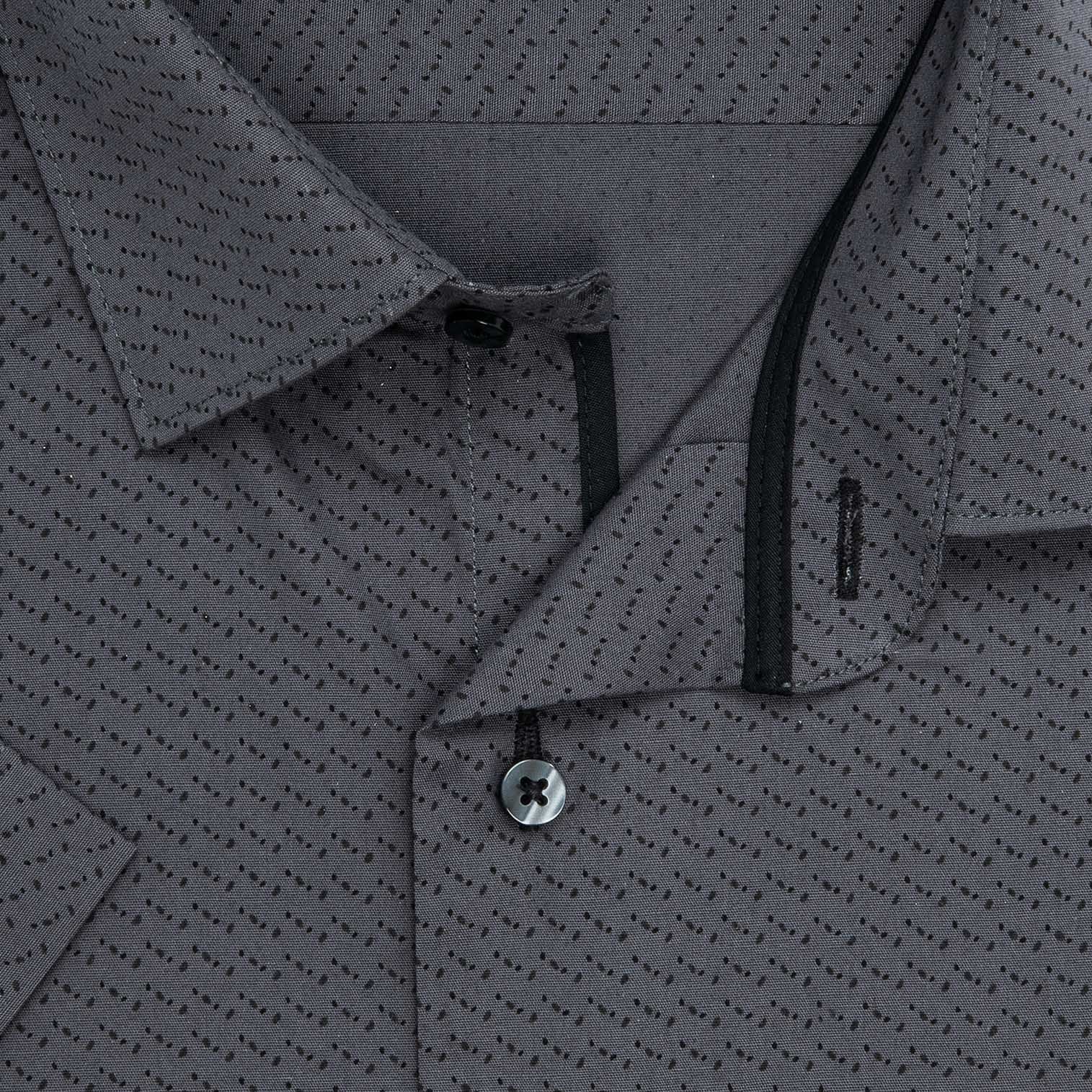 Pánská vzorovaná košile AMJ Comfort s krátkým rukávem. Pánská košile je v tmavě šedé barvě se vzorem teček s tmavými dop...